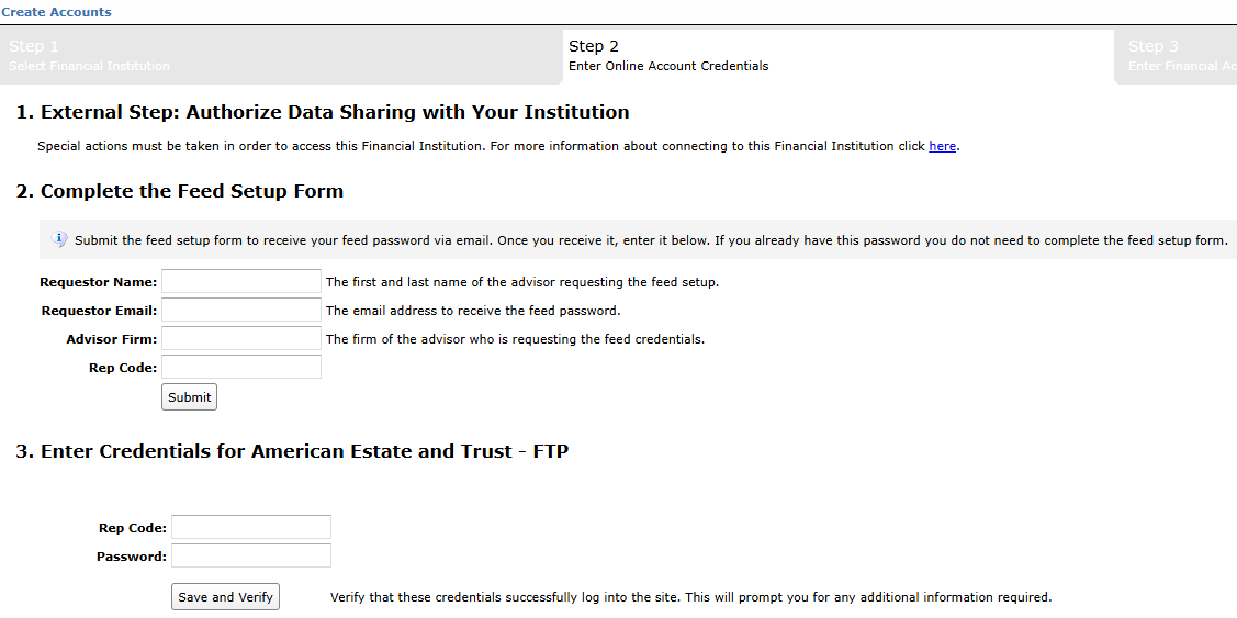 Step 1: Contact your American Estate and Trust Representative and ask that their data be added to the Morningstar ByAllAccounts feed. If you have multiple representatives on the American Estate and Trust platform, please specify which entities you would like to integrate with Morningstar ByAllAccounts.