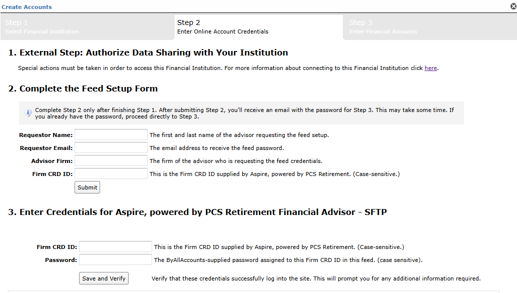 Step 1: Advisors should contact Aspire, powered by PCS Retirement at [email protected] to request that their data be added to the Morningstar ByAllAccounts feed.