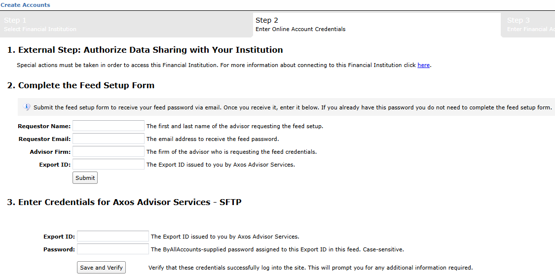 Step 1: Contact Axos Advisor Services and fill out a ‘Third-Party Export Request’ form to request your accounts to be added to the "Morningstar ByAllAccounts Axos Advisor Services - SFTP" feed.