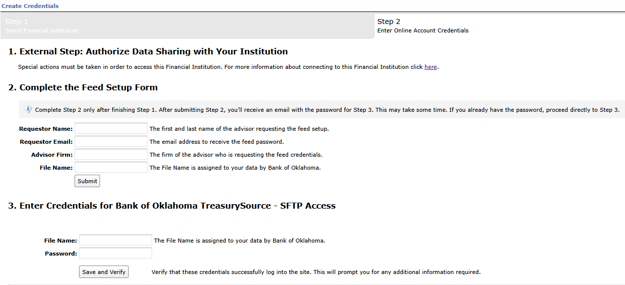 Feed access pre-requisitesThis feed supports Banking/Deposit accounts. For Trust and Investment accounts, please use Bank of Oklahoma Investments - SFTP Access.