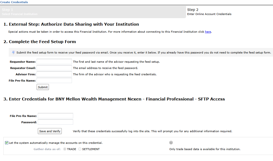 Step 1: Advisors/Third party managers should contact the Customer Service Representative at BNY Mellon Nexen to request daily file extracts for the direct feed "BNY Mellon Wealth Management Nexen - Financial Professional - SFTP Access", BNY Site Prefix: MBA01ERC, with Morningstar ByAllAccounts.