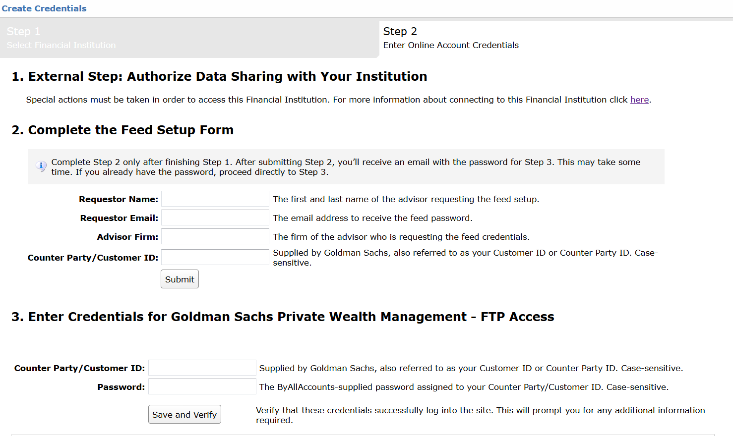 Step 1: Advisors/third party managers should contact their Goldman Sachs Representative and request that client's data be added to the Morningstar ByAllAccounts feed. The Goldman Sachs Representative will provide the required paperwork with instructions for completion.