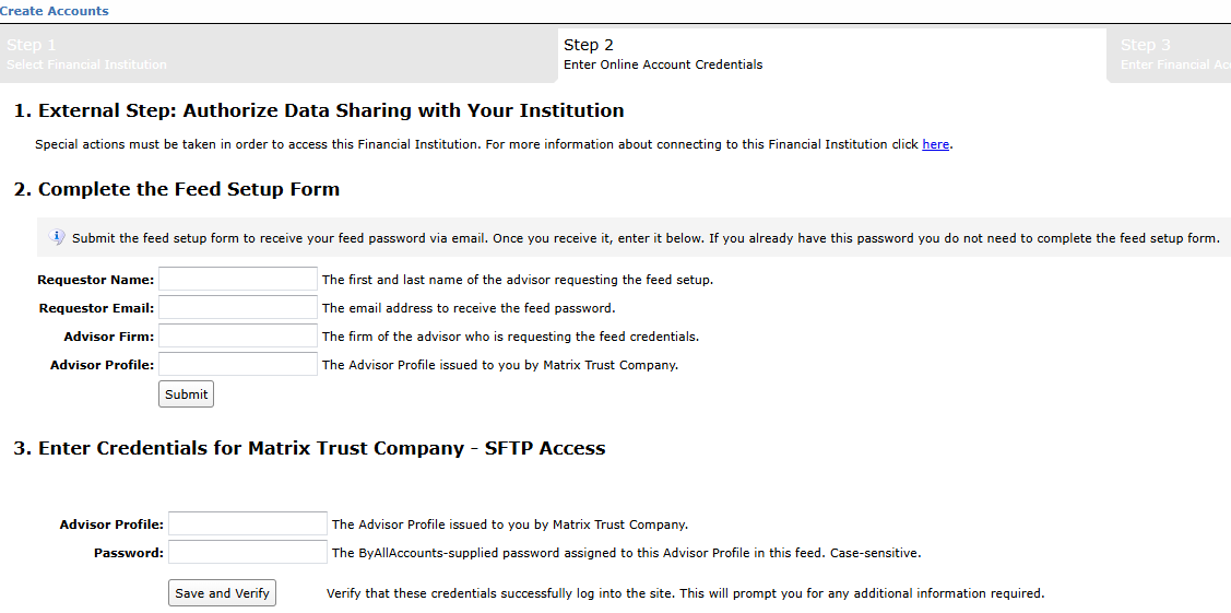 Step 1: Contact your plan's Recordkeeper or Third-Party Administrator to request your accounts to be added to the "Morningstar ByAllAccounts Matrix Trust Company - SFTP Access" feed.