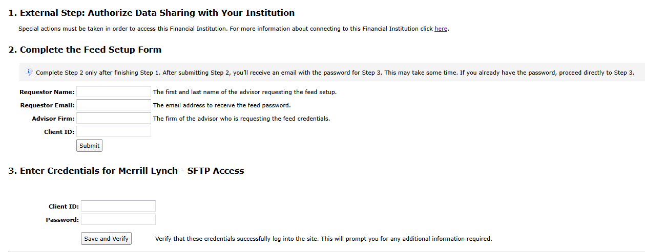 Feed access pre-requisitesUsers not registered at Merrill Lynch with managing discretion over accounts will require the account holder(s) to complete a Letter of Authorization (LOA). ML will assist with this process.