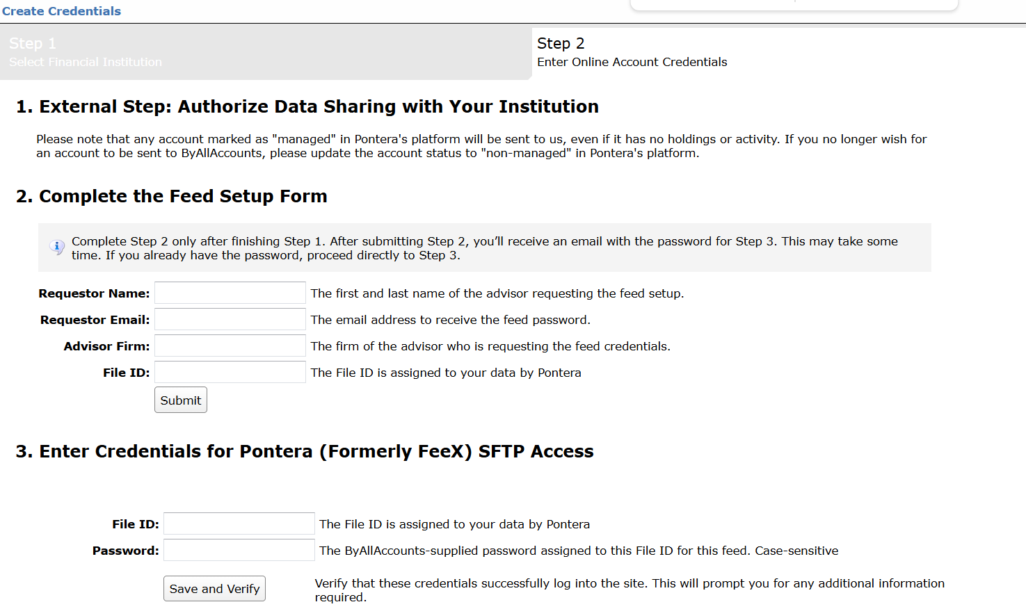 Step 1: Advisor/Firm must reach out to their Pontera (Formerly FeeX) Partner Engagement Manager (or [email protected]) and request their data be added to the Morningstar SFTP feed.
