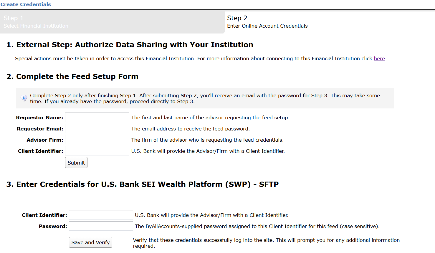 Step 1: Advisors/Firms should contact their relationship manager at U.S. Bank to request their data get added to the files prepared for ByAllAccounts on the Morningstar's STFP server.