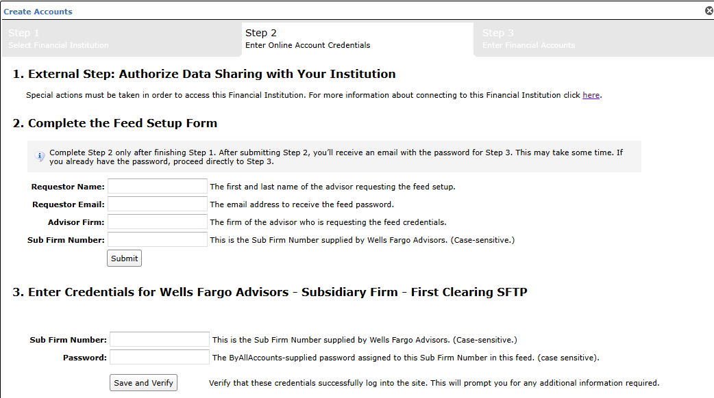 Step 2: Once the feed setup is complete, Wells Fargo will provide a confirmation to the Advisor and ByAllAccounts of the Sub Firm Number.